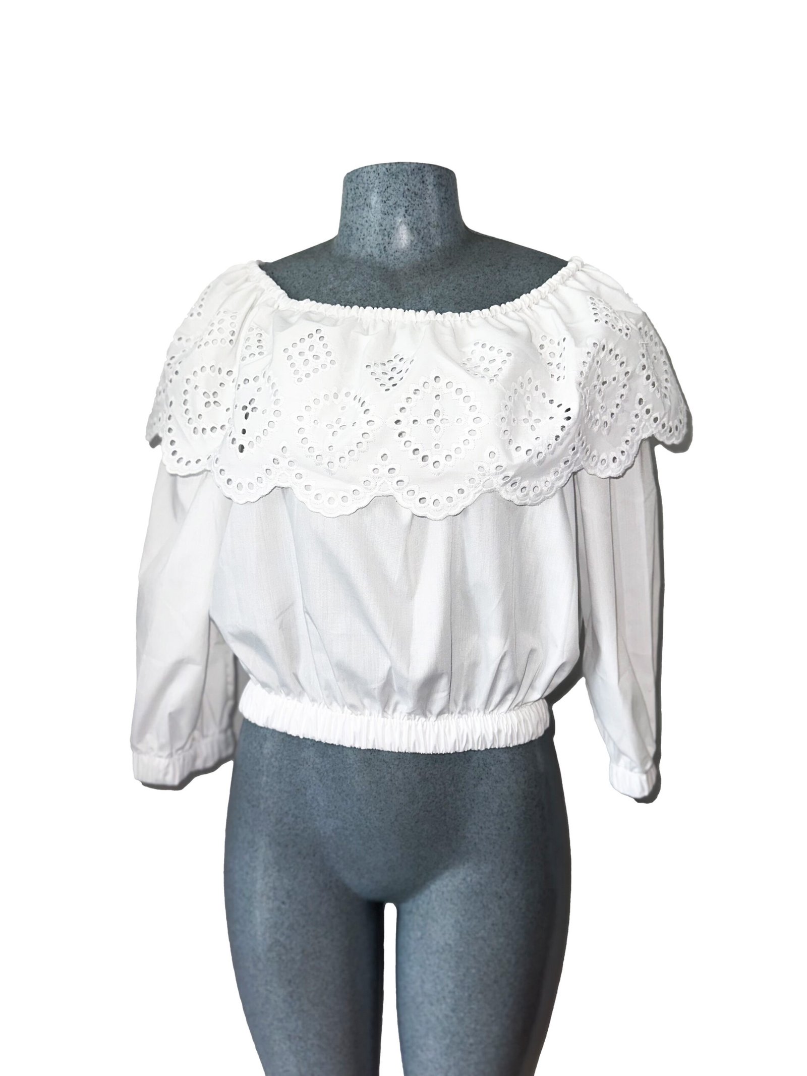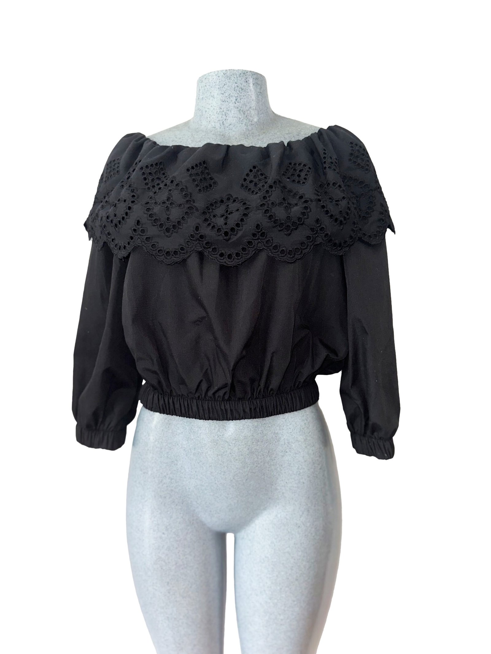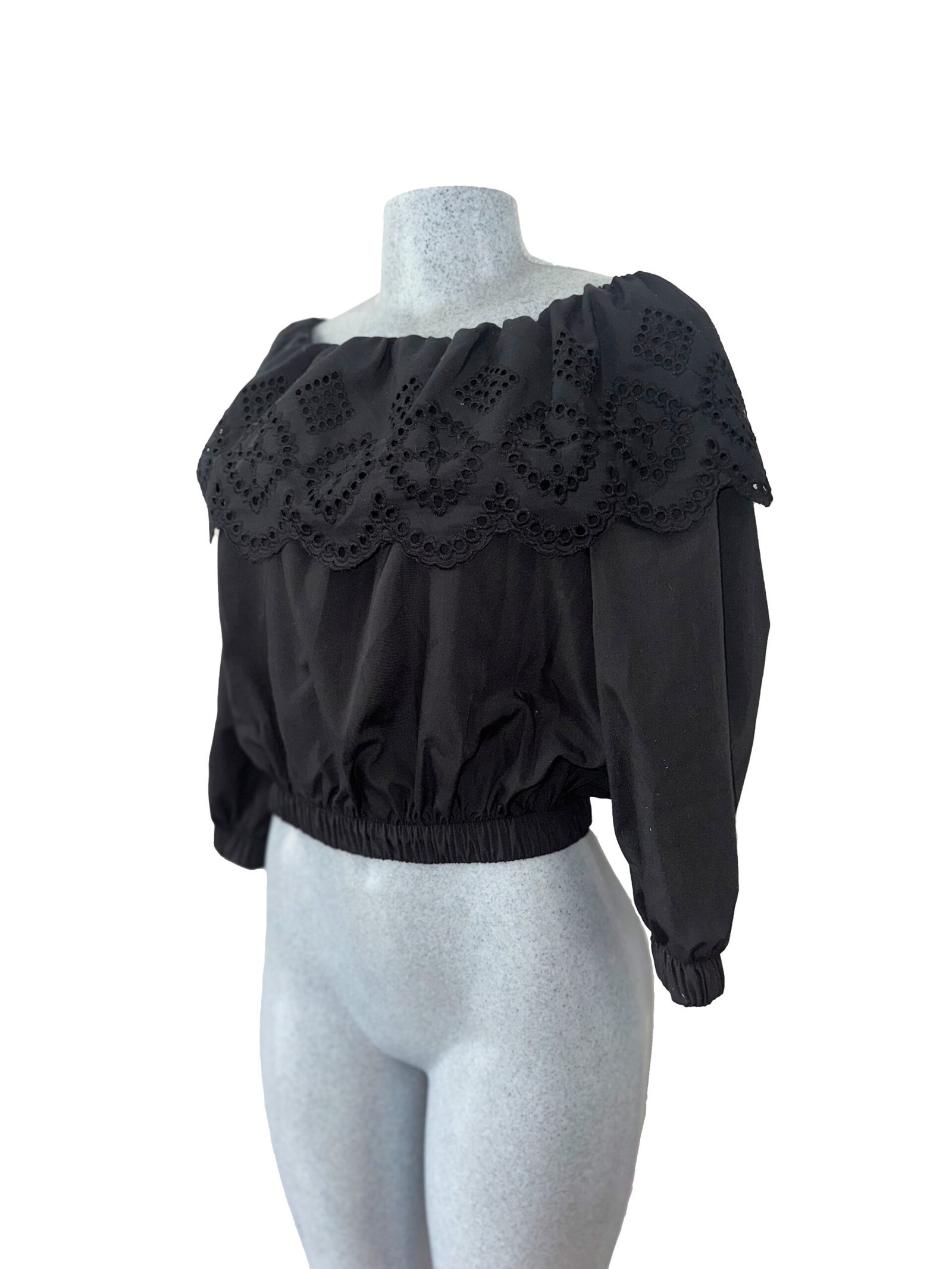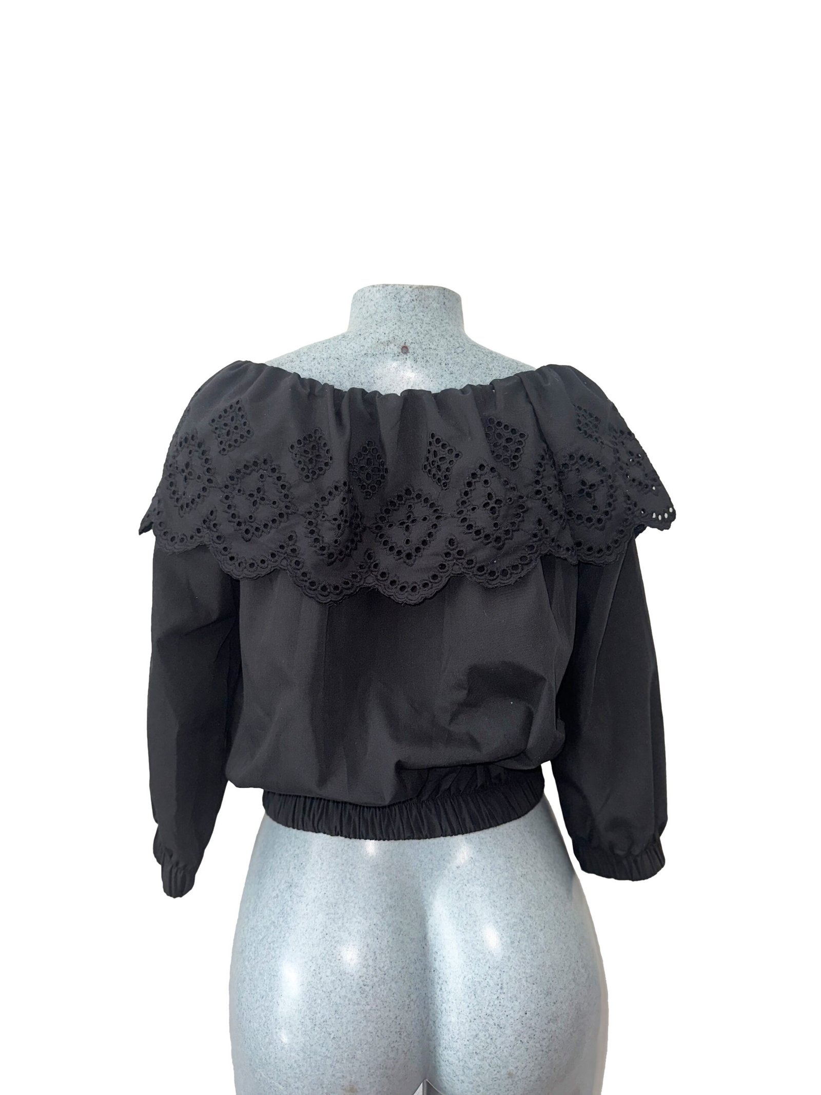 Ajoutez une touche d’élégance à votre garde-robe avec ce magnifique haut noir en broderie anglaise. Son col large et volanté met en valeur votre port de tête, tandis que sa coupe fluide et ses manches bouffantes offrent un style à la fois raffiné et confortable.