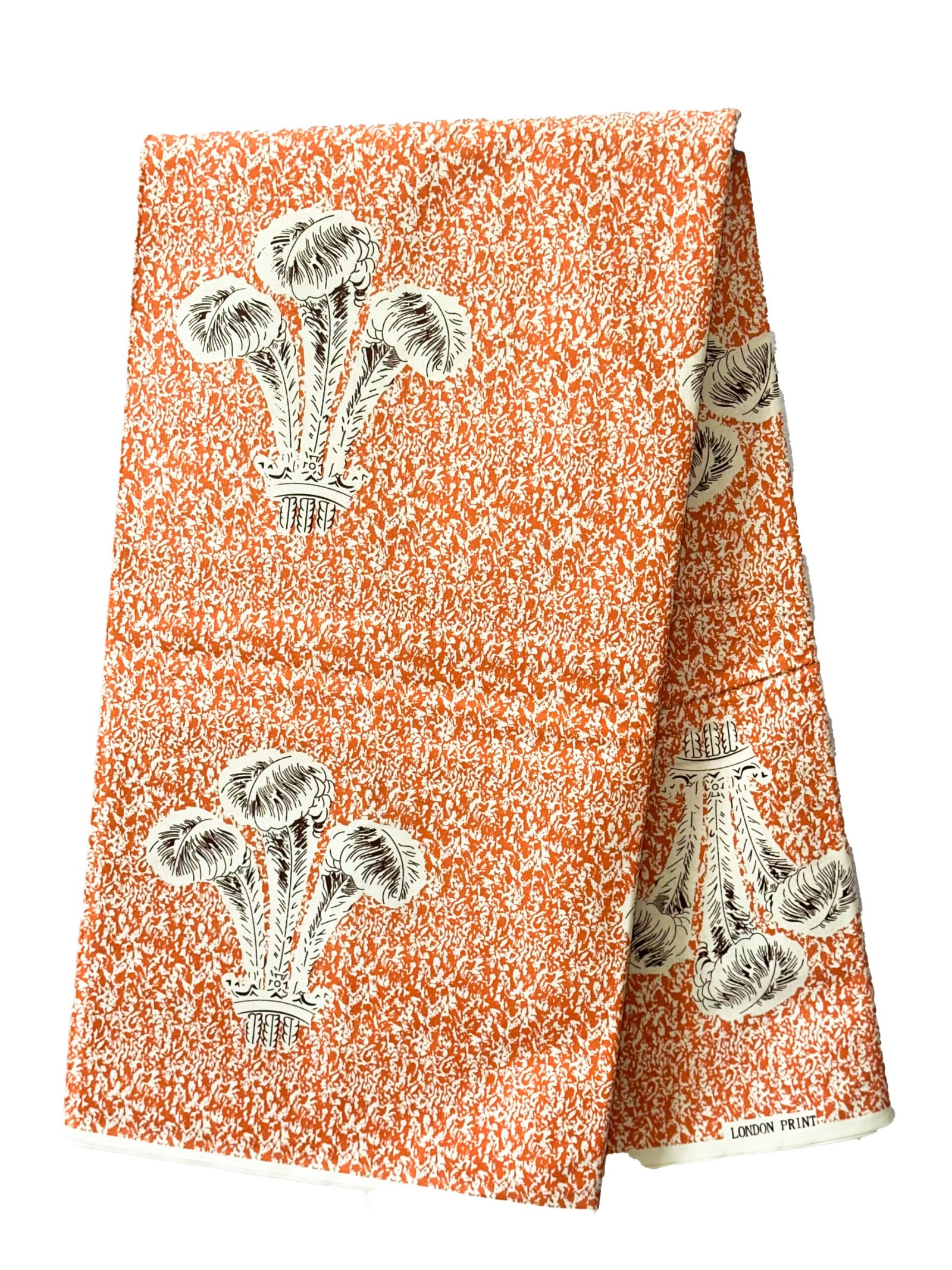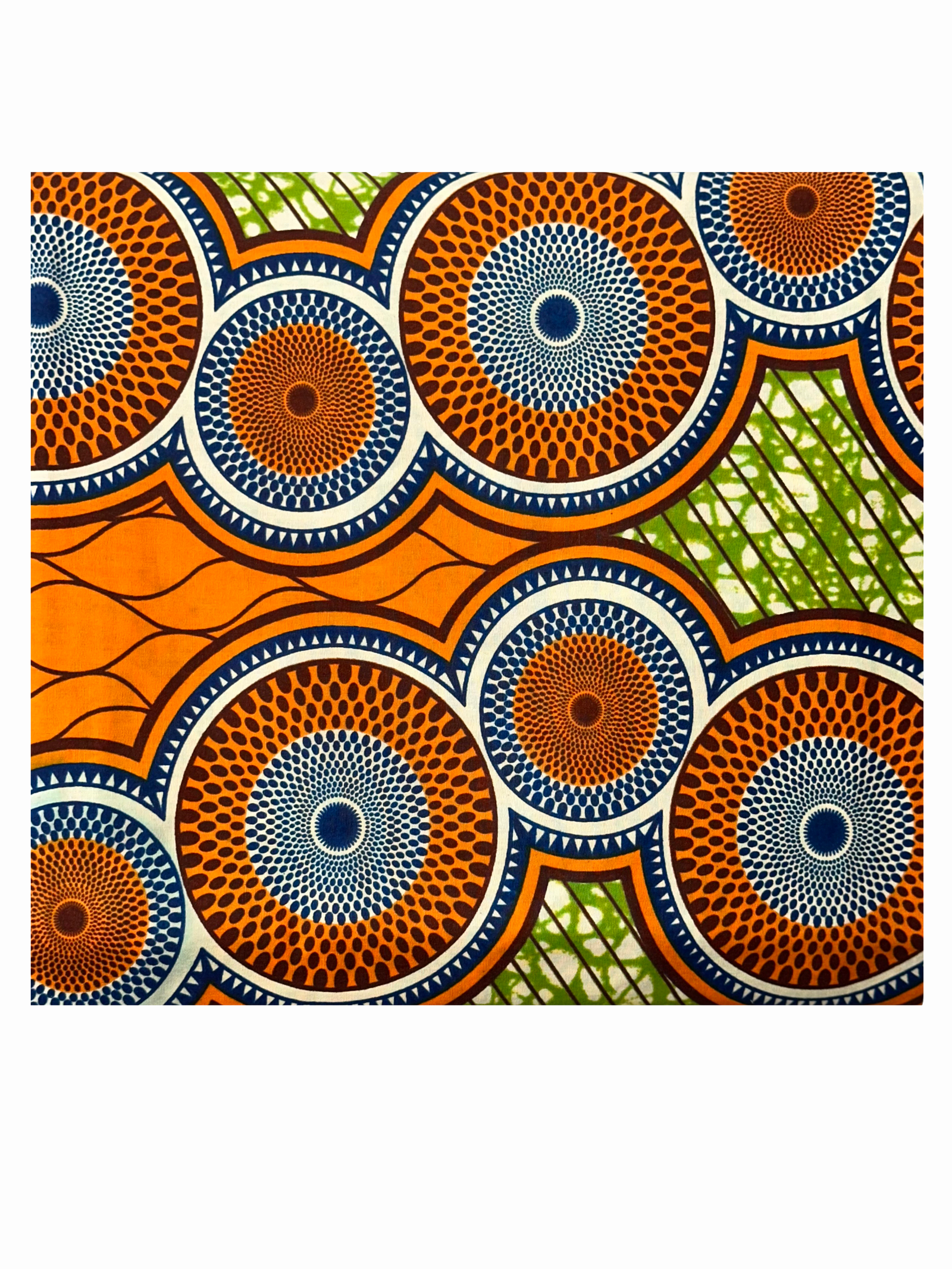 Tissu africain en coton, motif classique de fleurs stylisées sur un fond blanc et orange. Dimensions : 6 yards, idéal pour vos créations vestimentaires et décoratives.